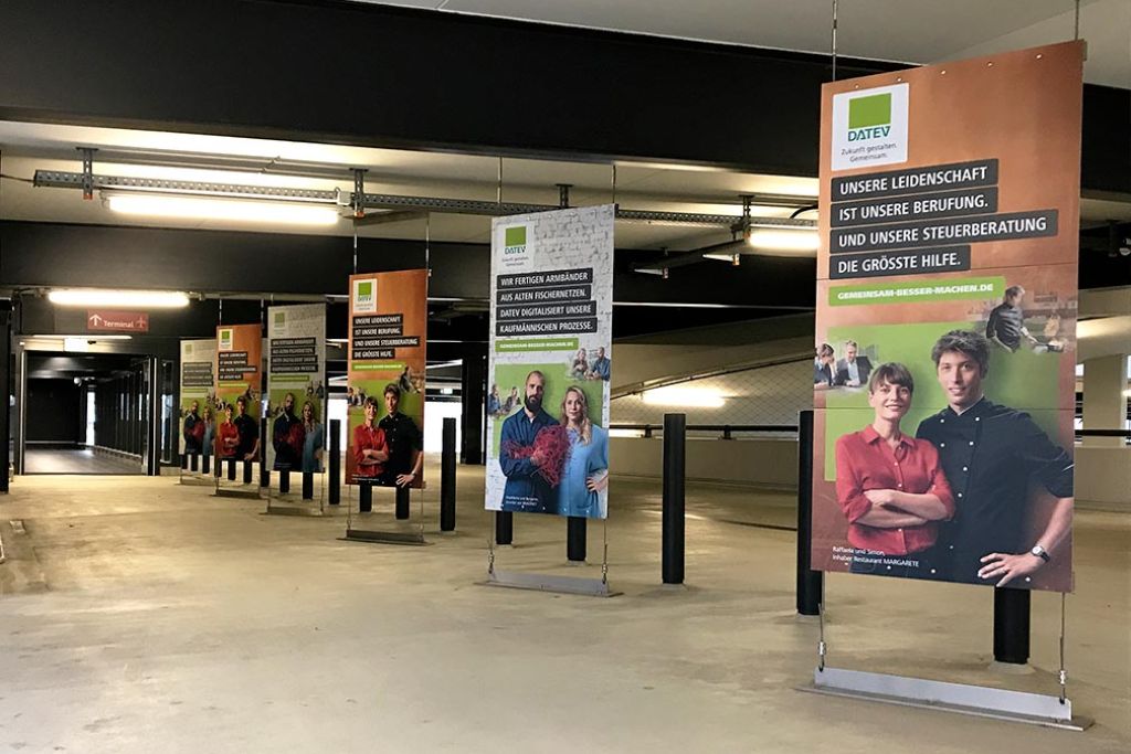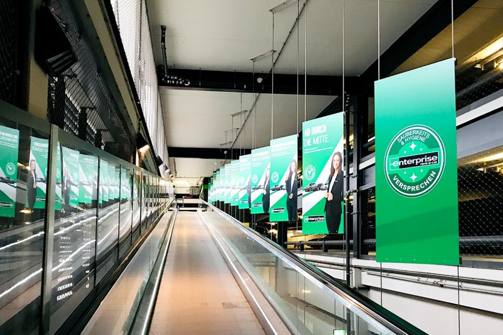 Entlang des Laufbandes und des Fußweges Richtung Terminal – unsere Bannernetze im Mietwagencenter entgehen weder Mietwagenkunden noch abfliegenden Passagieren.