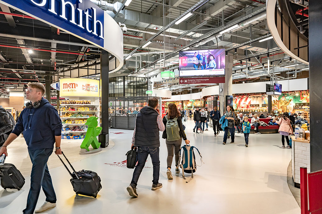 Nutzen Sie das Potenzial der digitalen Werbeflächen in der Umgebung von Shops und Gastronomien, und erreichen Sie Kunden direkt am Point of Sale! Nutzen Sie die aufmerksamkeitsstarke Platzierung der sechs Screens auf der Plaza des Terminals 2.