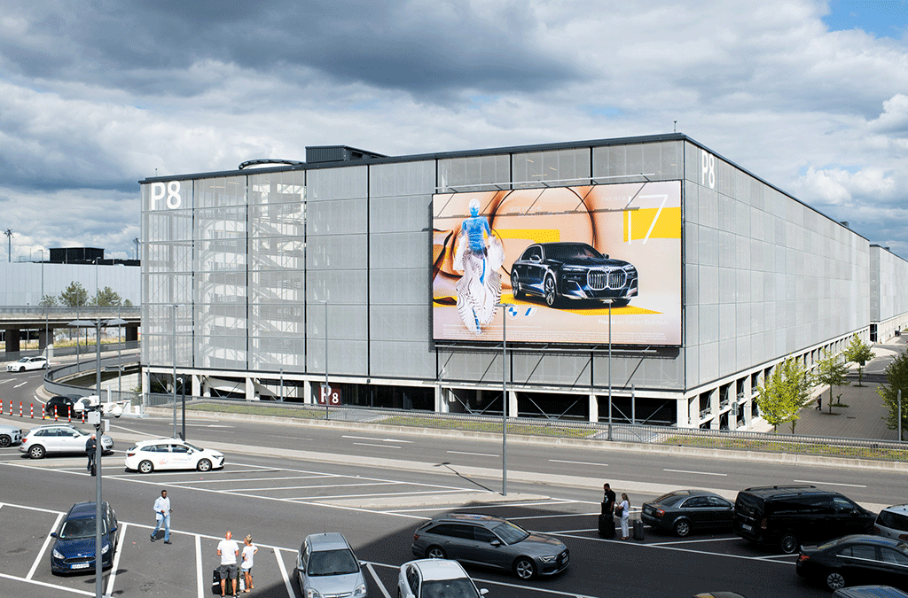Große Reichweite – dieses Riesenposter am Parkhaus P8 wird von der Vorfahrt und vom Check-in Bereich gesehen und liegt damit im Blickfeld abfliegender Passagiere und ihrer Meeter & Greeter.