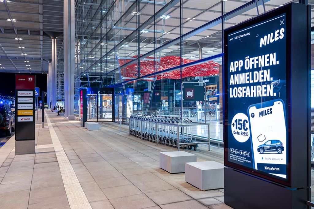 „Einfach App öffnen & MILES fahren“ lautet eine der Werbebotschaften, mit denen der Car Sharing Anbieter MILES Mobility seine potenziellen Kunden am BER willkommen heißt. Das in Berlin ansässige Unternehmen fokussiert sich mit insgesamt sieben analogen Werbeflächen auf ankommende Fluggäste und begleitet diese auf ihrem Weg von den Gates über die Ankunftsbereiche bis in den Außenbereich.