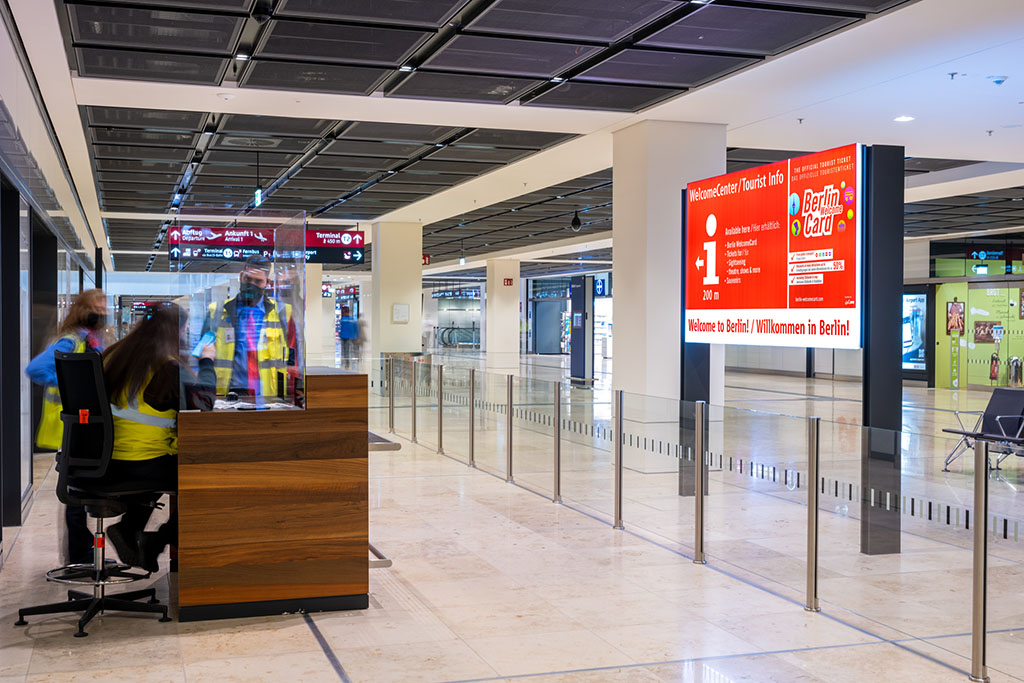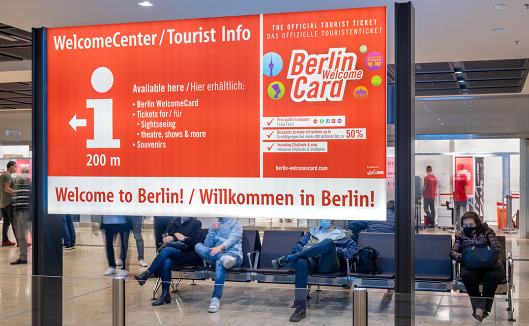 Direkt gegenüber der zwei Ausgänge aus der Gepäckausgabe befinden sich diese hinterleuchteten Flächen. Alleinstehend sind sie ein echter Hingucker und erster Werbeträger im öffentlichen Bereich.