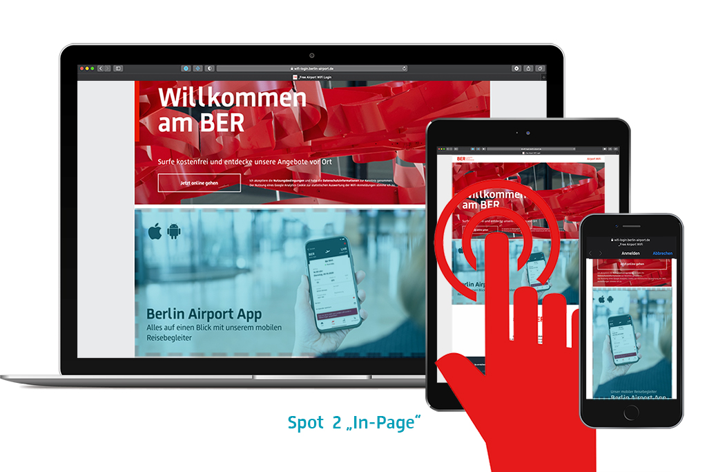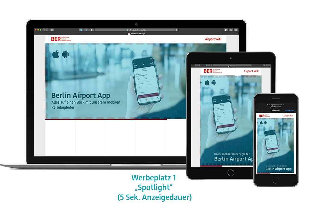 Im ersten Schritt sind Sie als Sponsor auf der Startseite des Login-Portals mit einer vollflächigen „Spotlight“ Anzeige (100% Breite) während 5 Sekunden präsent. Im zweiten Schritt wird Ihr Werbemotiv auf der FBB Landingpage mittels „In-page“ eingebunden. In beiden Schritten können Stand- oder Bewegtbilder eingespielt werden. Zudem ist eine direkte Verlinkung auf Ihre Ziel-URL (Deutsch und Englisch) und ein umfassendes Tracking möglich.