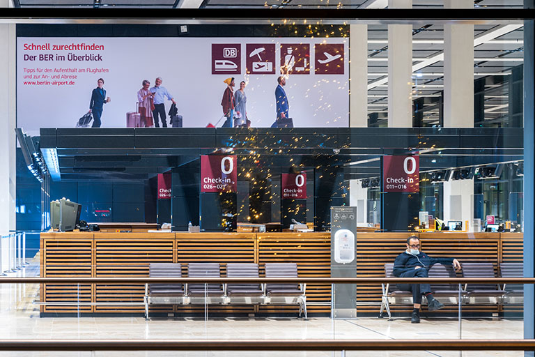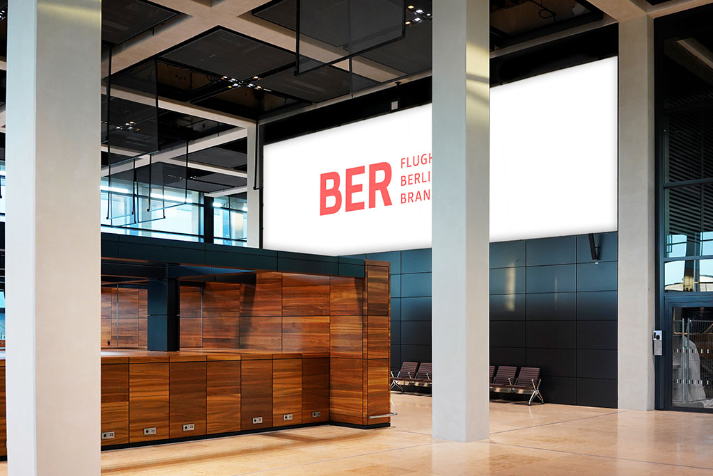 Optimalmaß für Maxi-Wirkung: Ihre Werbung hinter den Check-in Schaltern und direkt gegenüber der Vorfahrt. Beam me up!