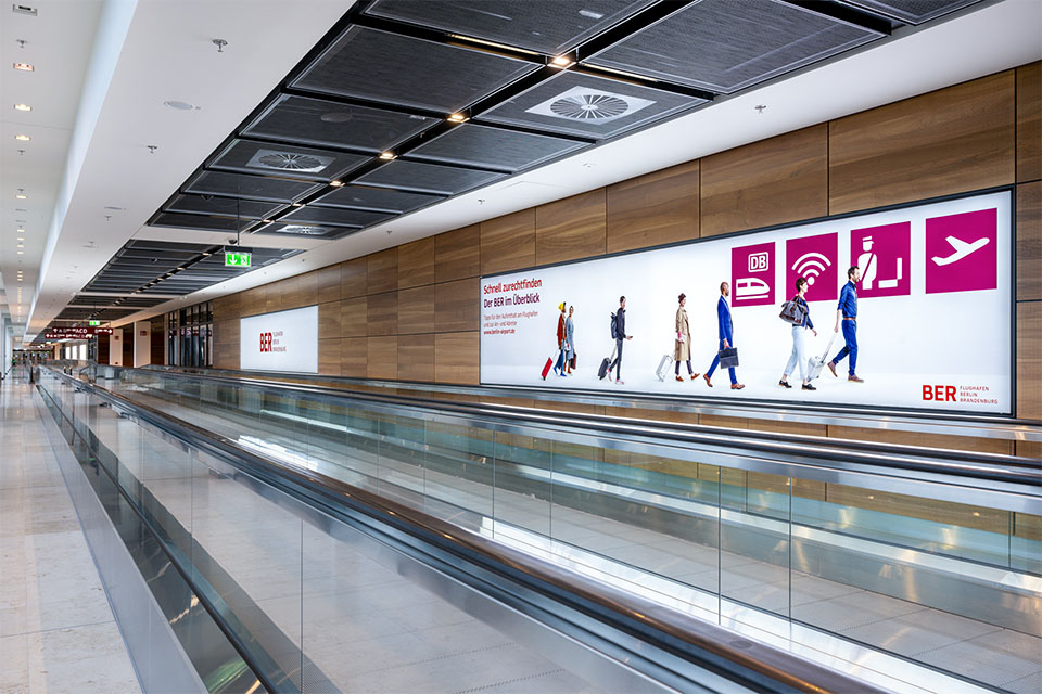 Erfolg am laufenden Band: Ein Netz von zwölf großen Landscapeflächen im Mainpier an den vier Laufbändern von und zu den Gates. Hier rollt das Interesse ankommender und abfliegender Schengen-Passagiere auf Sie zu.