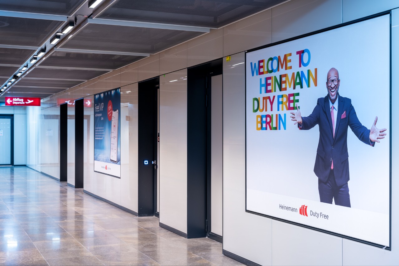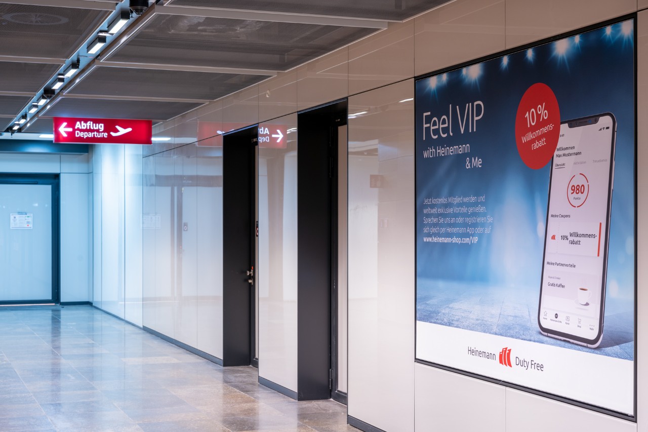 Laufend neue Kunden erobern: Sechs Landscapeflächen im Netz im Laufgang Richtung Marktplatz nach der Sicherheitskontrolle.
