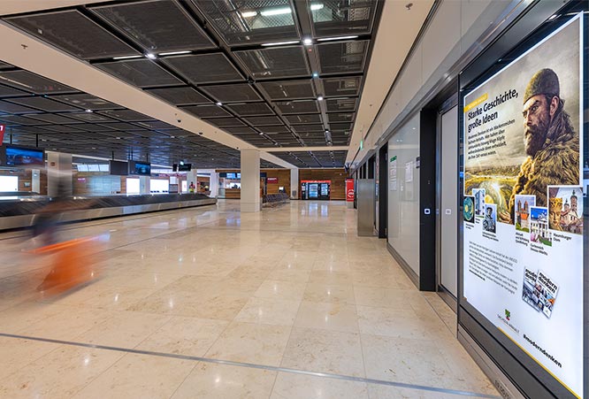 Unübersehbar für ankommende Passagiere: Drei Poster Vitrinen Netze im Bereich der Gepäckausgabe. Hinterleuchtet für noch mehr Ausstrahlung.
