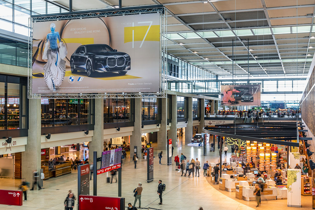 Two double-sided and static advertising spaces, dangling from the ceiling and located directly at the exit of the duty free shop after the security check.