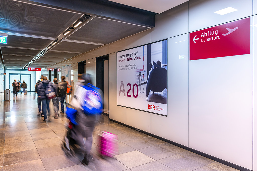 Use these advertising spaces to reach departing passengers from Terminal 1 after security checks - your advertising on the wall panels in the transition area to the marketplace guarantees maximum attention.