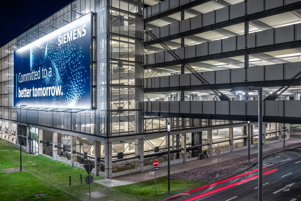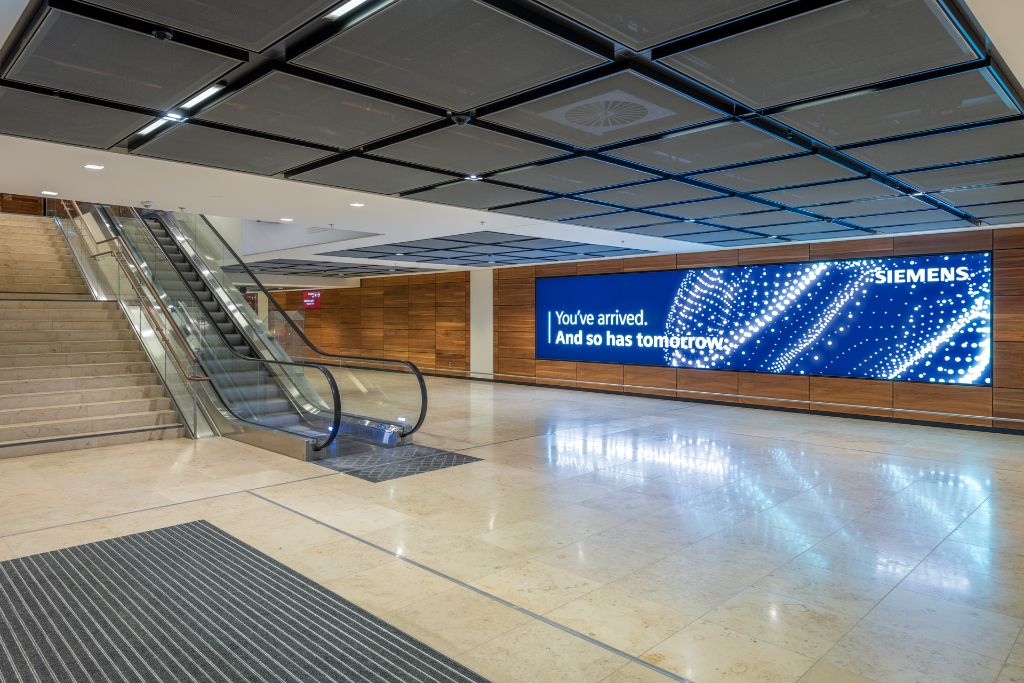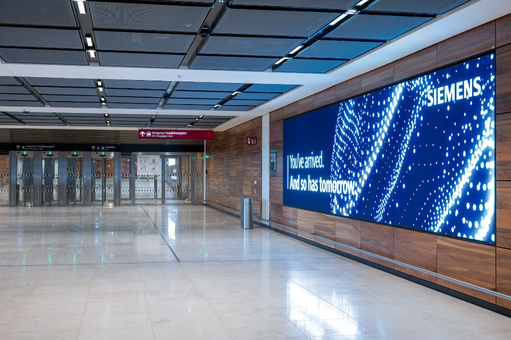 The technology Group Siemens covers the giant poster on multi-storey carpark to terminals 1 and 2 with “Committed to a better tomorrow”. Siemens also shows its presence with two backlit landscape areas, one each in the North arrivals walkway and South ̈arrivals walkway. Siemens thus not only reaches Schengen passengers arriving in Berlin but also non-Schengen passengers on their way to the baggage conveyor belts and exits.