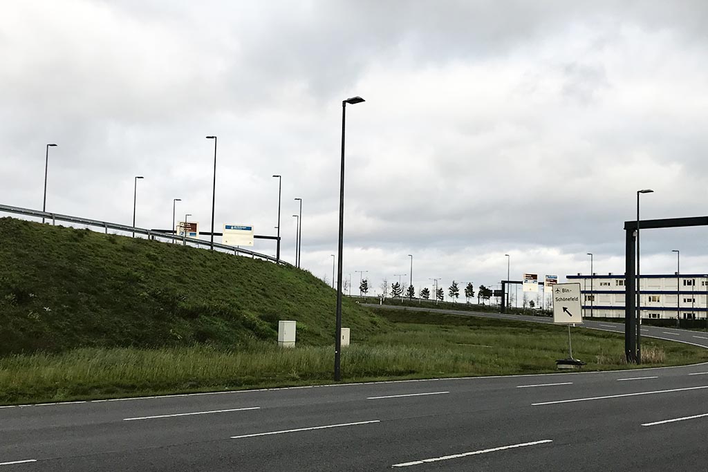 In der Kurve zur zentralen BER Abfahrt ist eine kundenindividuell gestaltete, analoge (ggf. digitale) Werbeanlage vorgesehen. Das Werbeobjekt, beispielsweise in Form eines riesigen Formenlogos, soll sich in das Gesamtbild des BER einfügen und für Millionen von Besuchern das Image der Region prägen. Je nach Ausgestaltung ist Ihr Werbeauftritt sichtbar für sämtliche Fahrzeuge aus Richtung Ankunfts- & Abflugebene und vom zentralen Vorplatz des Berlin Brandenburg Airport Centers kommend. Nutzen Sie die lange Kontaktzeit dieses zentral gelegenen und aufmerksamkeitsstarken Außenwerbestandortes für Ihr individuelles Werbeobjekt.