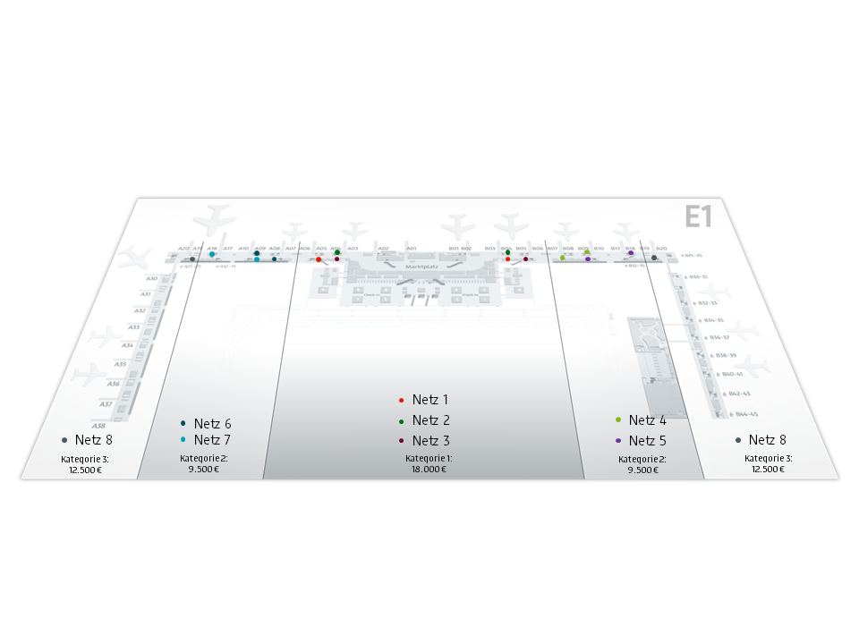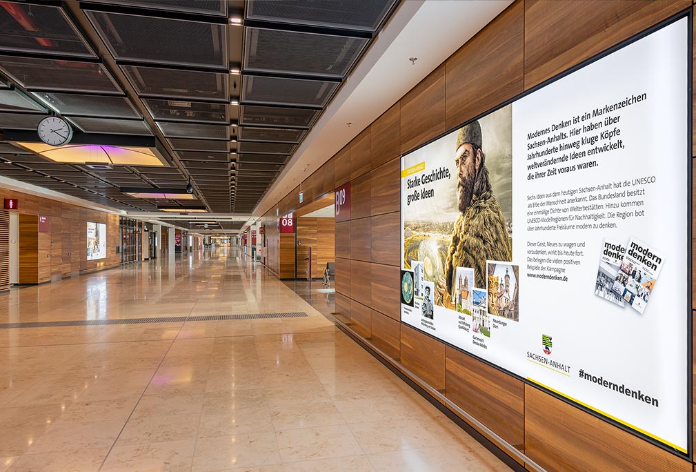 Become a high flyer – with 16 landscapes in the gangway to the gates distributed along the whole length of the main pier (715 metres), perfectly positioned to grab the attention of departing and arriving Schengen passengers.